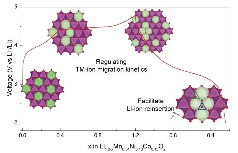 1. 揭示了富锂正极面内过渡金属离子迁移形成锂空位团簇,是影响阴离子氧化还原可逆性与容量的关键;
