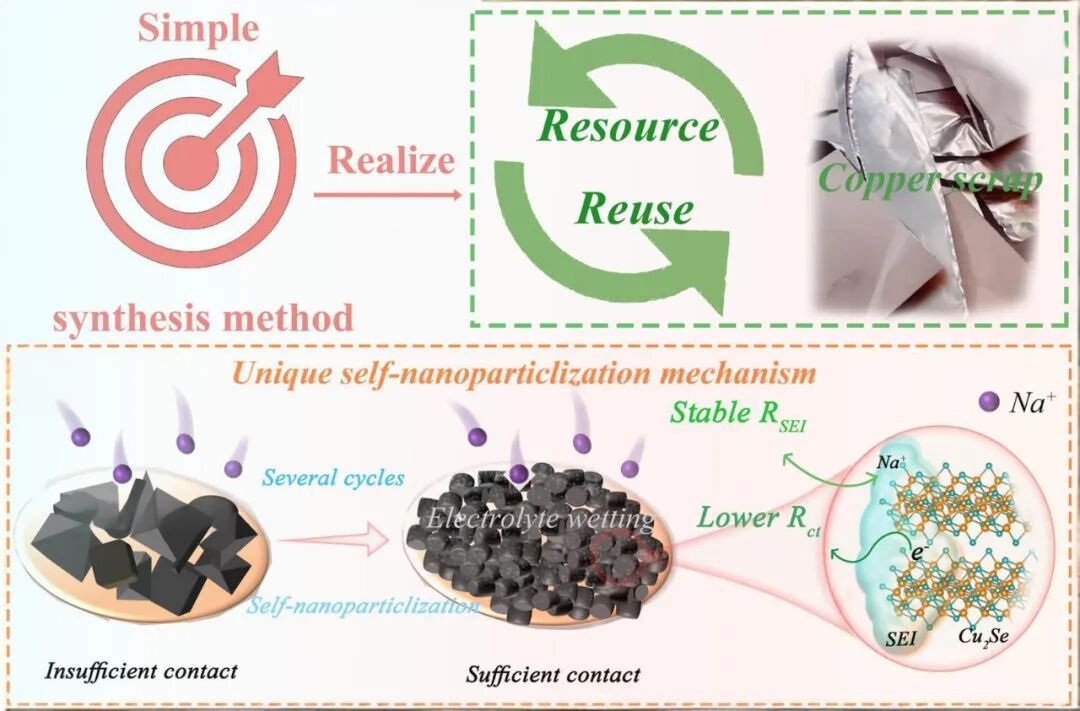 广东工业大学孙志鹏、邵涟漪团队研究论文:高效低成本合成自纳米颗粒化β-Cu2Se负极实现高性能宽温域钠离子电池 1. 通过固相硒化工艺将废铜箔转化为β-Cu2Se微粒; 2. 自纳米化行为增强了电荷转移并稳定了固体电解质界面; 3. 基于β-Cu2Se负极和Na3V2(PO4)2F3正极的全电池在宽温域内展现出卓越性能。
