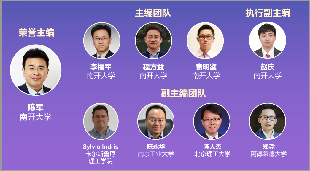 eScience Energy荣誉主编为南开大学陈军院士,创刊主编为南开大学李福军教授、程方益教授、袁明鉴教授;四位副主编分别为德国卡尔斯鲁厄理工学院Sylvio Indris教授、南京工业大学陈永华教授、北京理工大学陈人杰教授、澳大利亚阿德莱德大学郑尧教授。期刊已组建国际化编委会共包含来自10个国家的38位能源领域国际知名学者。