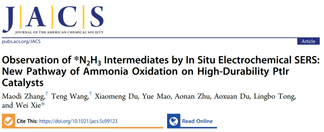 近日,物质绿色创造与制造海河实验室、南开大学化学学院谢微教授团队通过设计“双功能核-卫星超级结构”,结合原位表面增强拉曼光谱技术,成功捕捉到PtIr合金催化剂表面AOR过程中的关键中间体——*N₂H₃,并揭示了PtIr合金提升催化耐久性的核心机制。相关成果发表于国际顶级期刊《美国化学会志》(Journal of the American Chemical Society)。